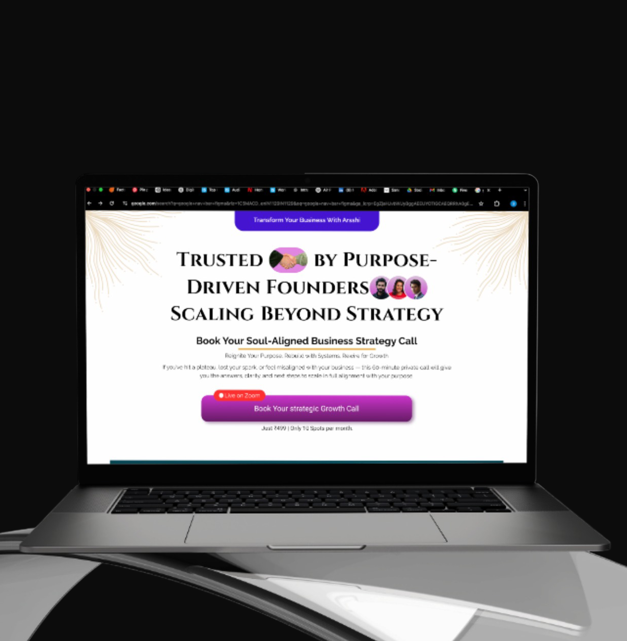 This landing page was designed for Arshi’s Masterclass to convert Meta ad traffic into bookings. The layout focuses on clear messaging, strong visuals, and strategic CTAs to guide users smoothly from the ad click to confirming their slot.